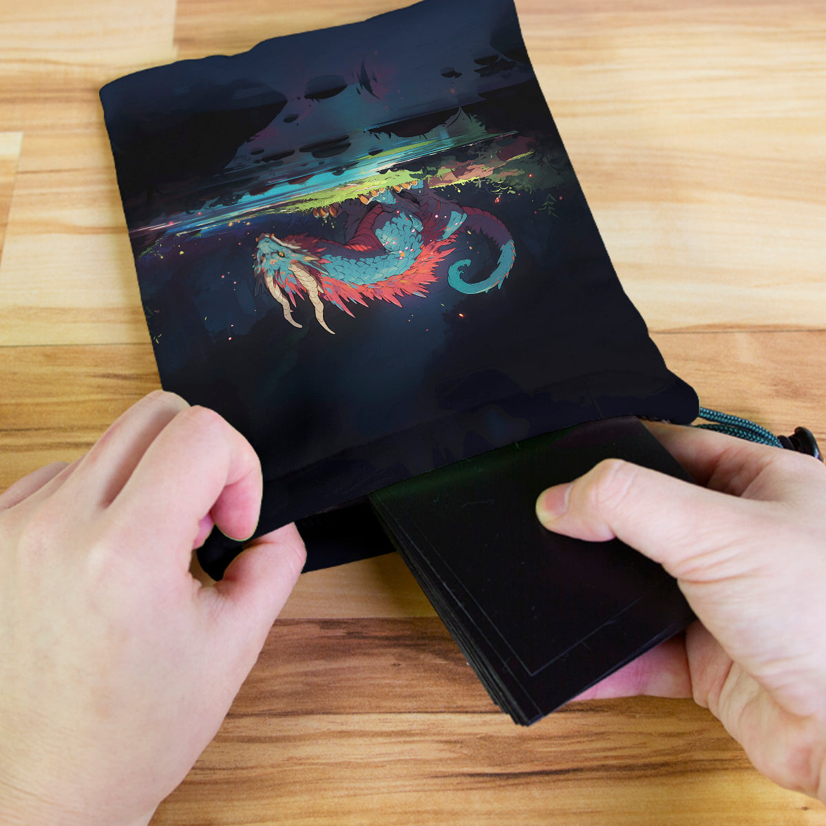 Always gaming on the go? Carry everything you need and more using our specially crafted dice bag. But this bag is designed to hold more than just dice. We make it so you can carry other essential accessories and gear with your dice, including deck boxes, life counters, extra sleeves, and pens. Quality is just as important as quantity, which is why our dice bags are crafted using premium material as well. Featuring a soft inner lining and microfiber on the inside and vibrant pre-designed artwork on the outside, our dice bag has an amazing look and feel to it!