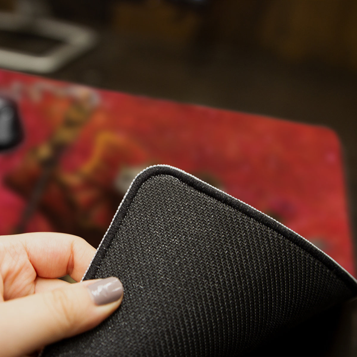 Need a new mousepad that features quality craftsmanship and creativity? Then you’ve definitely come to the right place. Our mousepads are made in-house with premium materials and unique artwork that give your battlestation the supreme look and feel that it deserves. The top is made from sleek polyester, which enables faster, more precise mouse movements. This enhanced speed and precision come in handy whether you’re working or gaming. On the bottom, there’s a strong anti-slip rubber backing that holds a nice, tight grip on your desk while you’re doing your thing. The action and traction this pad provides give you a better overall experience in completing daily tasks, deadlines, and missions of all kinds. And because we’ve added more sizing options to it, you no longer have to worry about running out of room at the worst moments either. The sizes are Classic, Large, and XL. The Classic mousepad has unstitched edges. However, the Large mousepad does include stitched edging, while the XL mousepad has both a stitched or unstitched edging option available. You can see the approximate measurements of all those sizes in the details below. We think you’ll be impressed…if you aren’t already!
