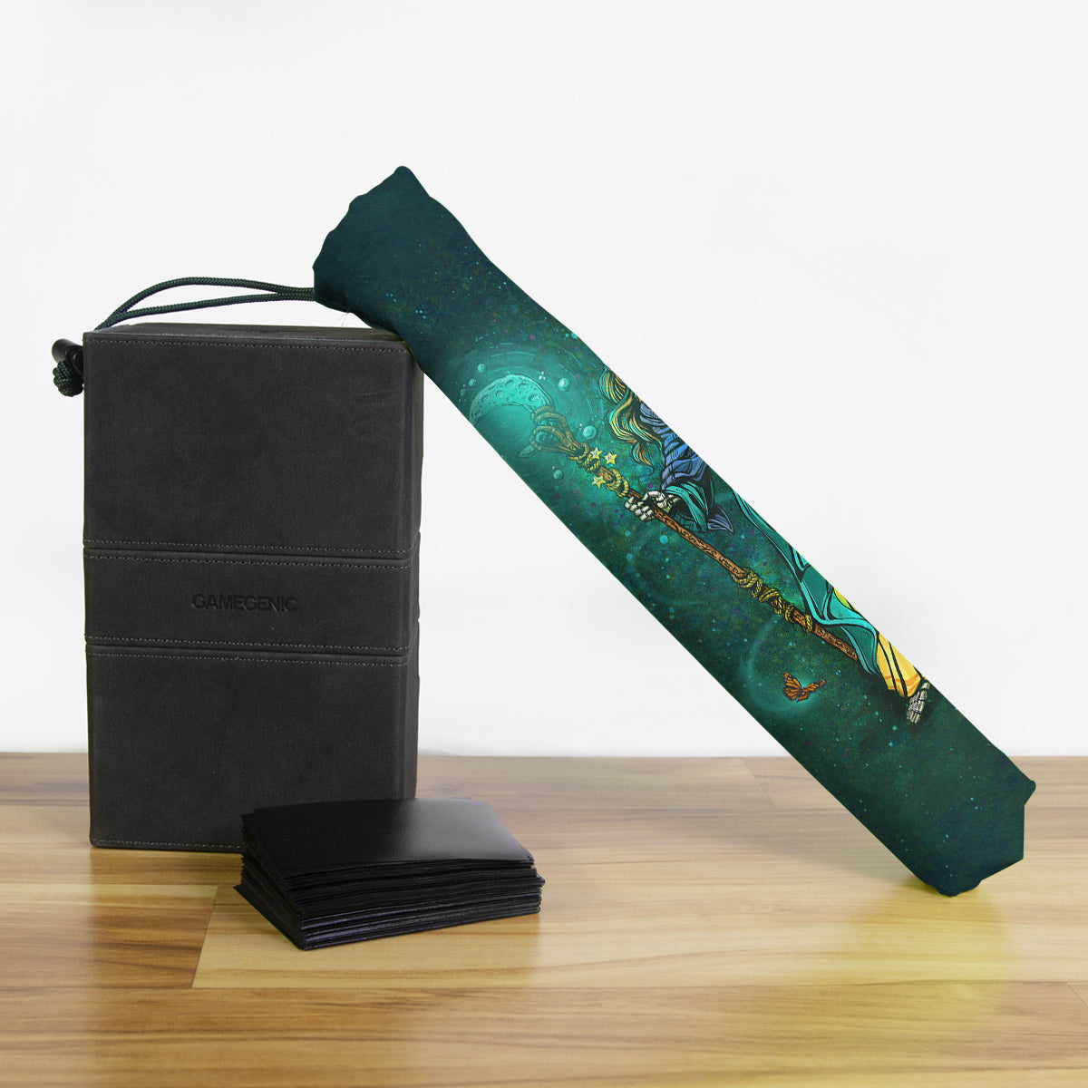 Keep your playmat in pristine condition wherever you go with one of our handcrafted playmat bags. This playmat bag is specifically designed to protect your playmat and can hold two standard sized mats at the same time (in case you need a backup or your friend forgets theirs). Each bag is made in-house and features a water-resistant coating along with a drawstring and carabiner clip for secure carrying. So you can take your game anywhere and in any weather.