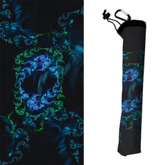 Playmat Bags are specifically designed to hold your mats in style. They are large enough to carry up to two mats. They are coated to be water resistant and include a strap with carabiner for carrying on your backpack. Our bags are hand made in house, and to order. A design that is vertical or patterned would be best for this type of product.