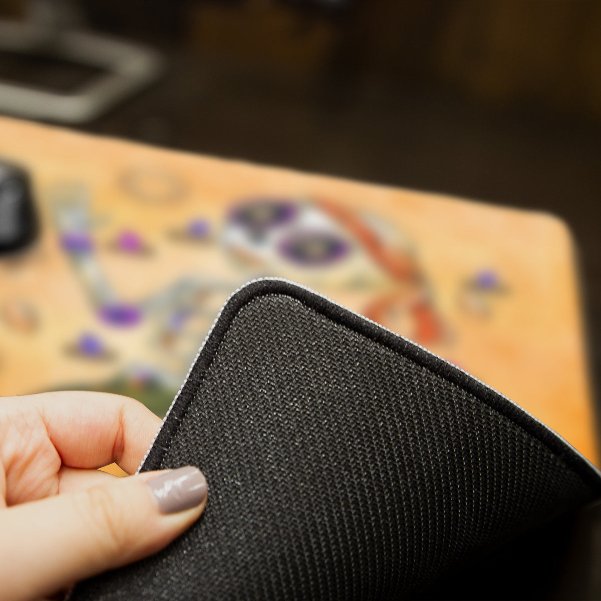 Need a new mousepad that features quality craftsmanship and creativity? Then you’ve definitely come to the right place. Our mousepads are made in-house with premium materials and unique artwork that give your battlestation the supreme look and feel that it deserves. The top is made from sleek polyester, which enables faster, more precise mouse movements. This enhanced speed and precision come in handy whether you’re working or gaming. On the bottom, there’s a strong anti-slip rubber backing that holds a nice, tight grip on your desk while you’re doing your thing. The action and traction this pad provides give you a better overall experience in completing daily tasks, deadlines, and missions of all kinds. And because we’ve added more sizing options to it, you no longer have to worry about running out of room at the worst moments either. The sizes are Classic, Large, and XL. The Classic mousepad has unstitched edges. However, the Large mousepad does include stitched edging, while the XL mousepad has both a stitched or unstitched edging option available. You can see the approximate measurements of all those sizes in the details below. We think you’ll be impressed…if you aren’t already!