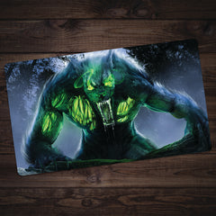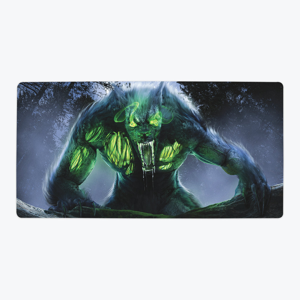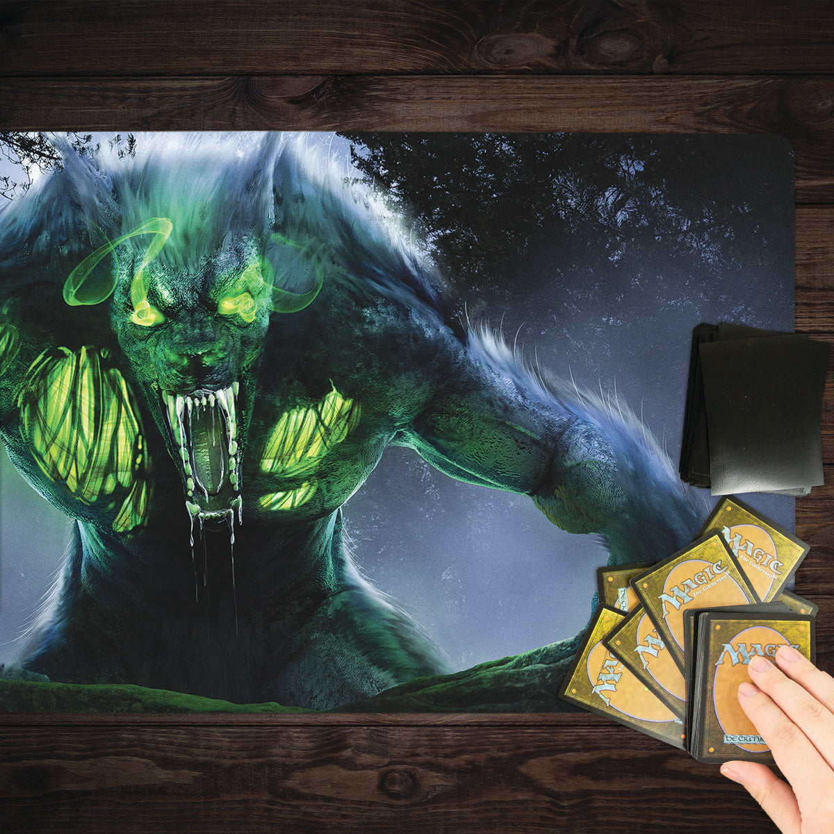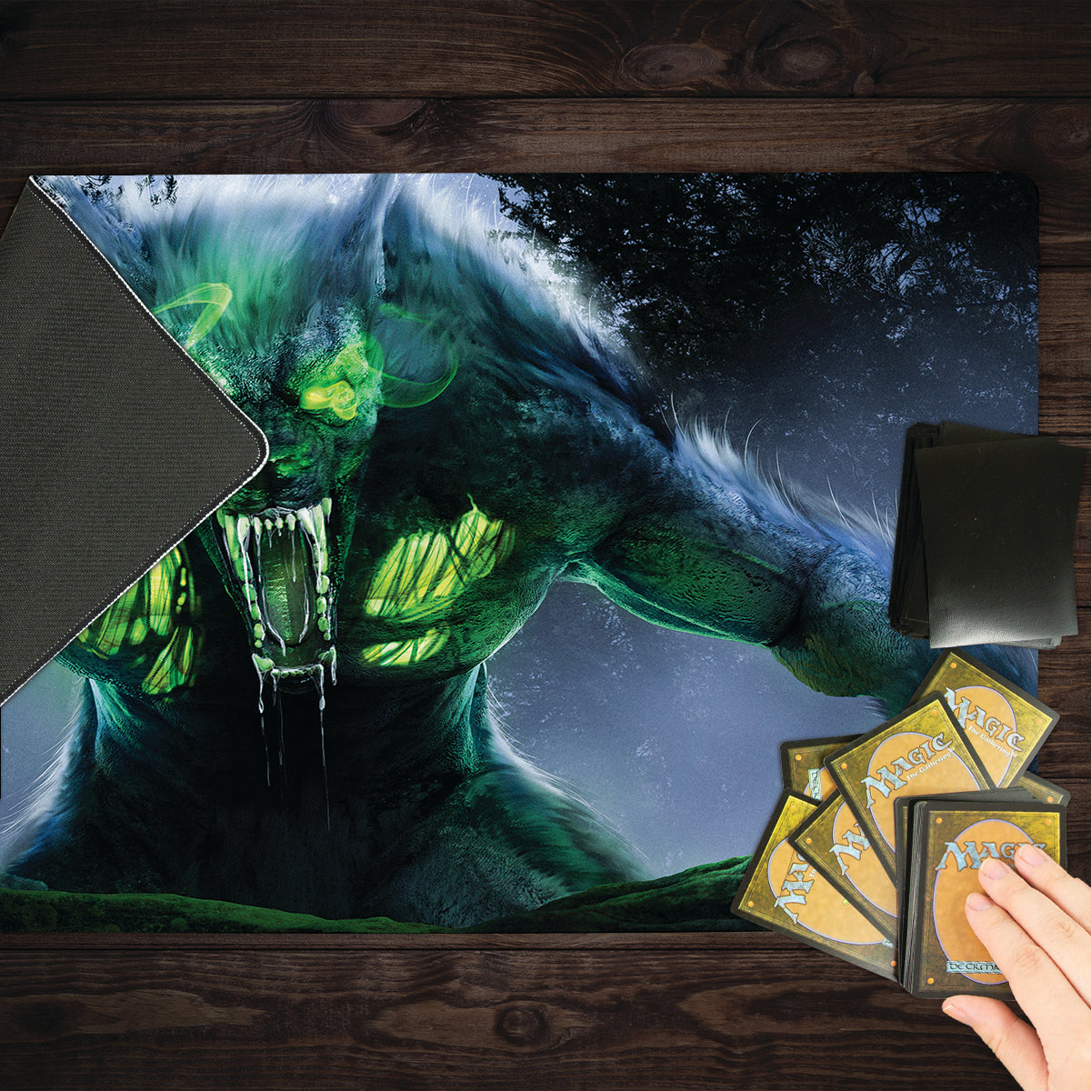 Oversized Playmat measures at 28” x 14” inches and is 1/16 of an inch thick. It’s made with a smooth cloth top and strong rubber backing.
