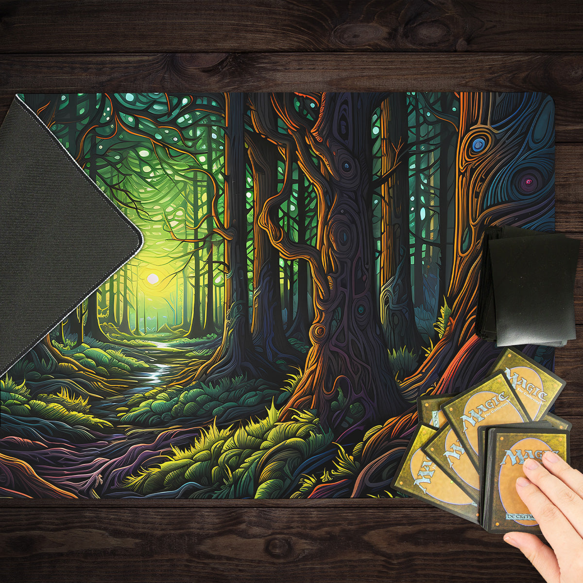 Oversized Playmat measures at 28” x 14” inches and is 1/16 of an inch thick. It’s made with a smooth cloth top and strong rubber backing.