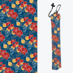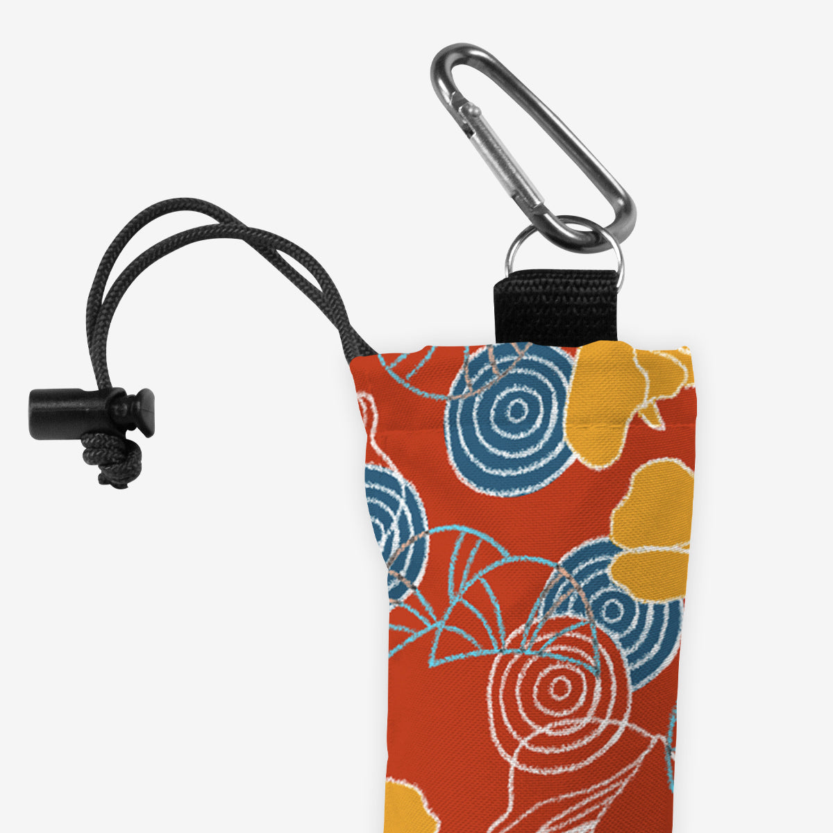 Playmat Bags are specifically designed to hold your mats in style. They are large enough to carry up to two mats. They are coated to be water resistant and include a strap with carabiner for carrying on your backpack. Our bags are hand made in house, and to order. A design that is vertical or patterned would be best for this type of product.