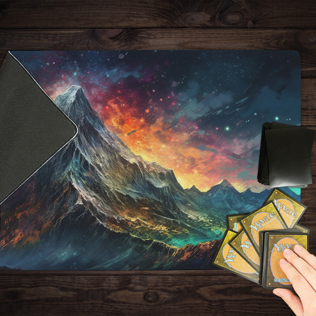 Oversized Playmat measures at 28” x 14” inches and is 1/16 of an inch thick. It’s made with a smooth cloth top and strong rubber backing.