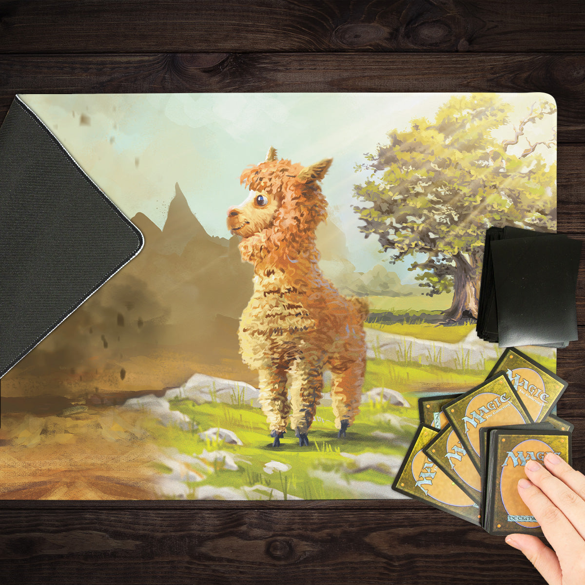 Oversized Playmat measures at 28” x 14” inches and is 1/16 of an inch thick. It’s made with a smooth cloth top and strong rubber backing.
