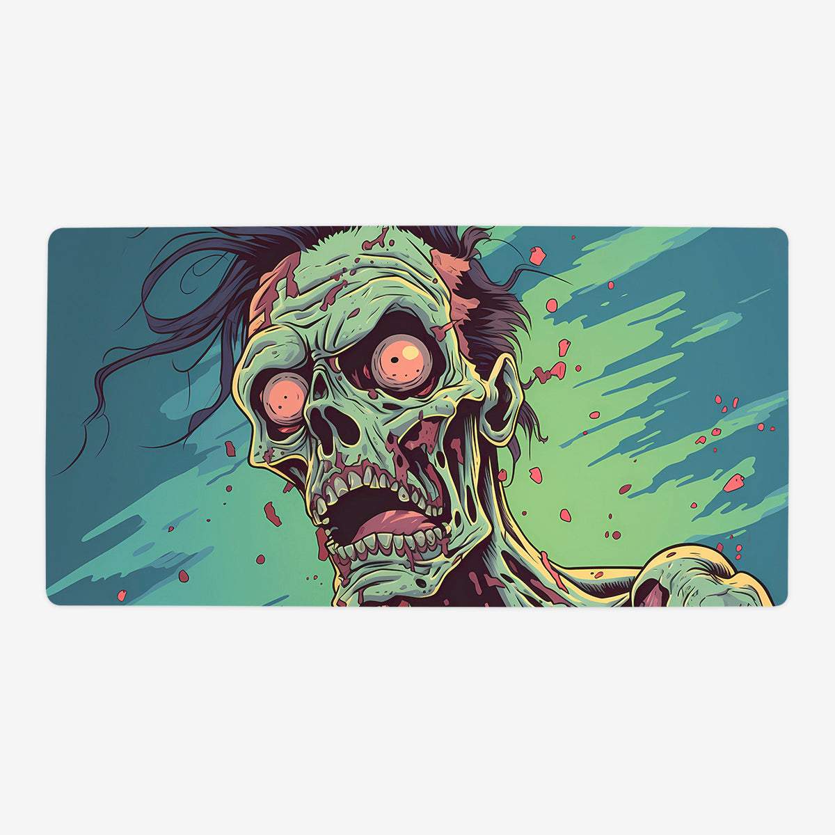 Oversized Playmat measures at 28” x 14” inches and is 1/16 of an inch thick. It’s made with a smooth cloth top and strong rubber backing.