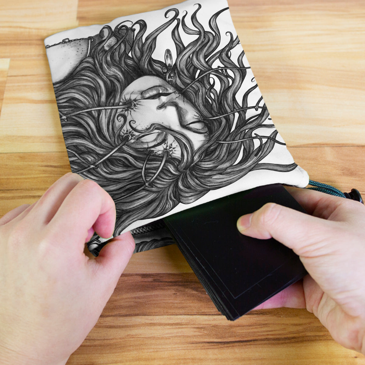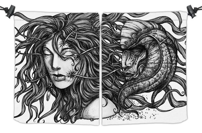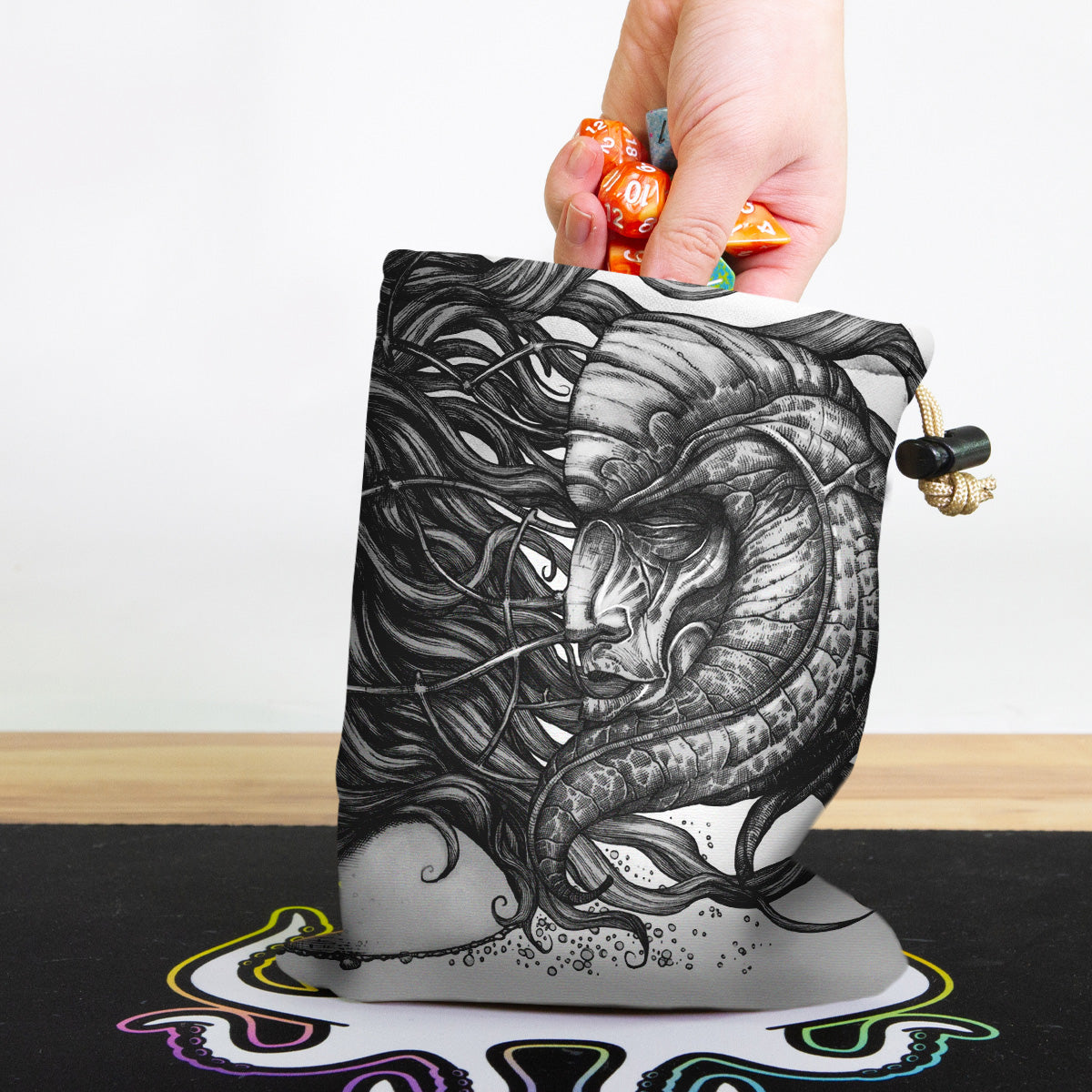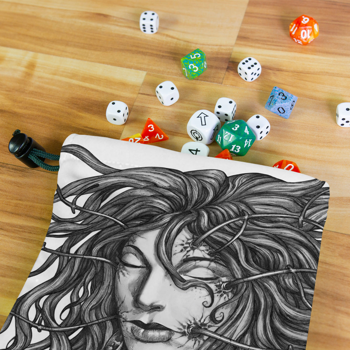 rkpostAlways gaming on the go? Carry everything you need and more using our specially crafted dice bag. But this bag is designed to hold more than just dice. We make it so you can carry other essential accessories and gear with your dice, including deck boxes, life counters, extra sleeves, and pens. Quality is just as important as quantity, which is why our dice bags are crafted using premium material as well. Featuring a soft inner lining and microfiber on the inside and vibrant pre-designed artwork on the outside, our dice bag has an amazing look and feel to it!