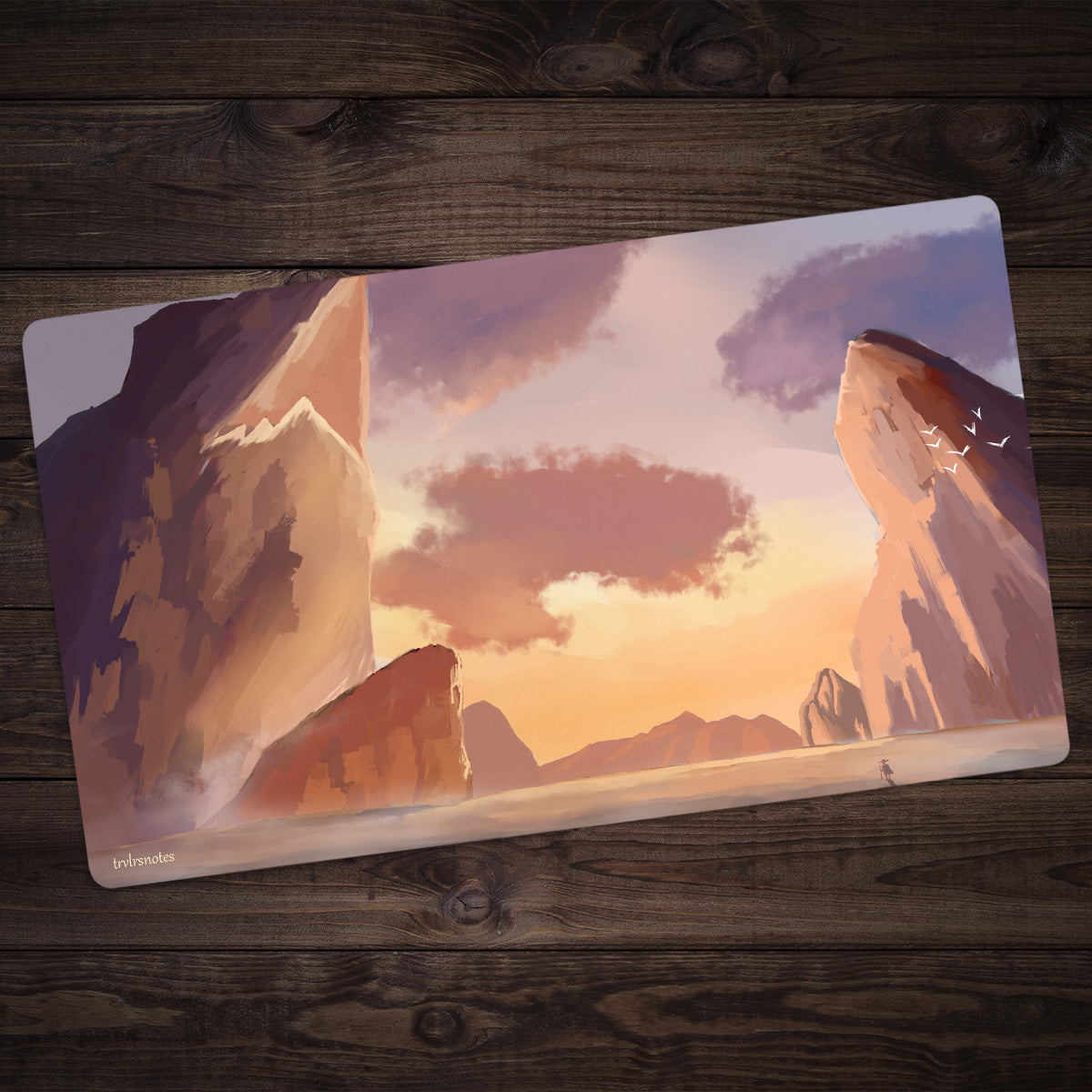 Standard Playmat measures at 24” x 14” inches and is 1/16 of an inch thick. It’s made with a smooth cloth top and strong rubber backing.