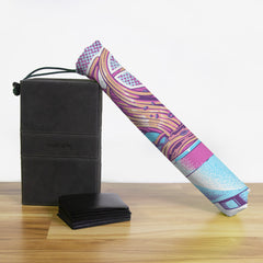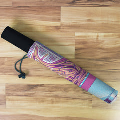 Playmat Bags are specifically designed to hold your mats in style. They are large enough to carry up to two mats. They are coated to be water resistant and include a strap with carabiner for carrying on your backpack. Our bags are hand made in house, and to order. A design that is vertical or patterned would be best for this type of product.