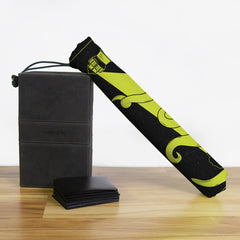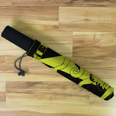 Playmat Bags are specifically designed to hold your mats in style. They are large enough to carry up to two mats. They are coated to be water resistant and include a strap with carabiner for carrying on your backpack. Our bags are hand made in house, and to order. A design that is vertical or patterned would be best for this type of product.