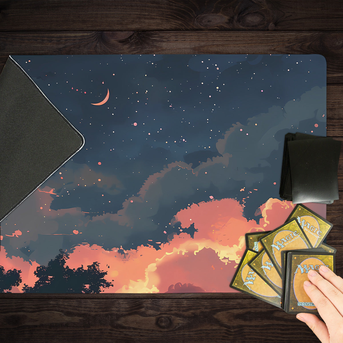 Oversized Playmat measures at 28” x 14” inches and is 1/16 of an inch thick. It’s made with a smooth cloth top and strong rubber backing.
