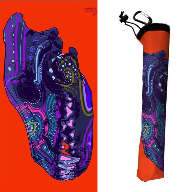 Playmat Bags are specifically designed to hold your mats in style. They are large enough to carry up to two mats. They are coated to be water resistant and include a strap with carabiner for carrying on your backpack. Our bags are hand made in house, and to order. A design that is vertical or patterned would be best for this type of product.