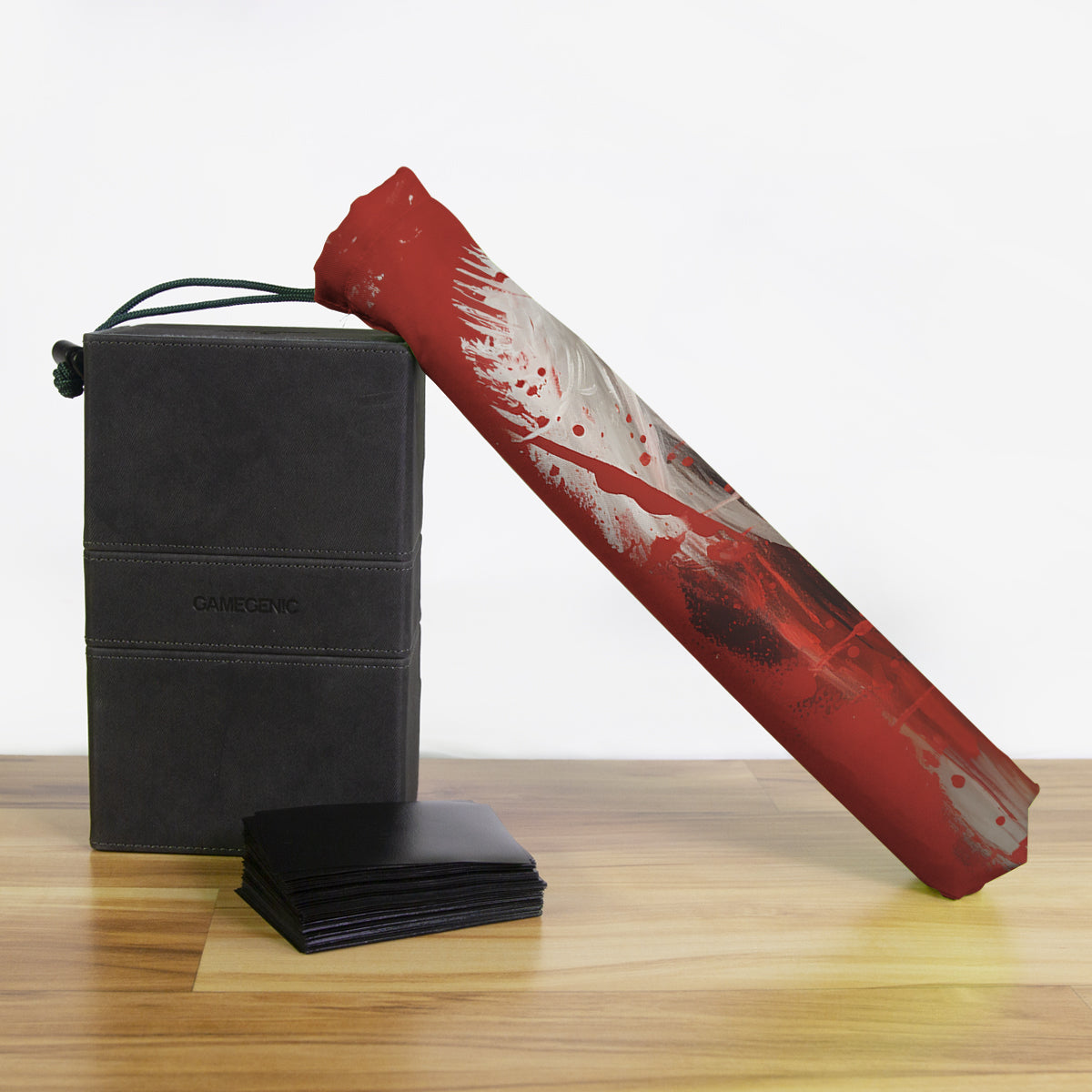 Keep your playmat in pristine condition wherever you go with one of our handcrafted playmat bags. This playmat bag is specifically designed to protect your playmat and can hold two standard sized mats at the same time (in case you need a backup or your friend forgets theirs). Each bag is made in-house and features a water-resistant coating along with a drawstring and carabiner clip for secure carrying. So you can take your game anywhere and in any weather.