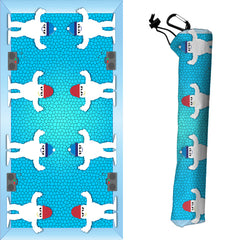 Playmat Bags are specifically designed to hold your mats in style. They are large enough to carry up to two mats. They are coated to be water resistant and include a strap with carabiner for carrying on your backpack. Our bags are hand made in house, and to order. A design that is vertical or patterned would be best for this type of product.