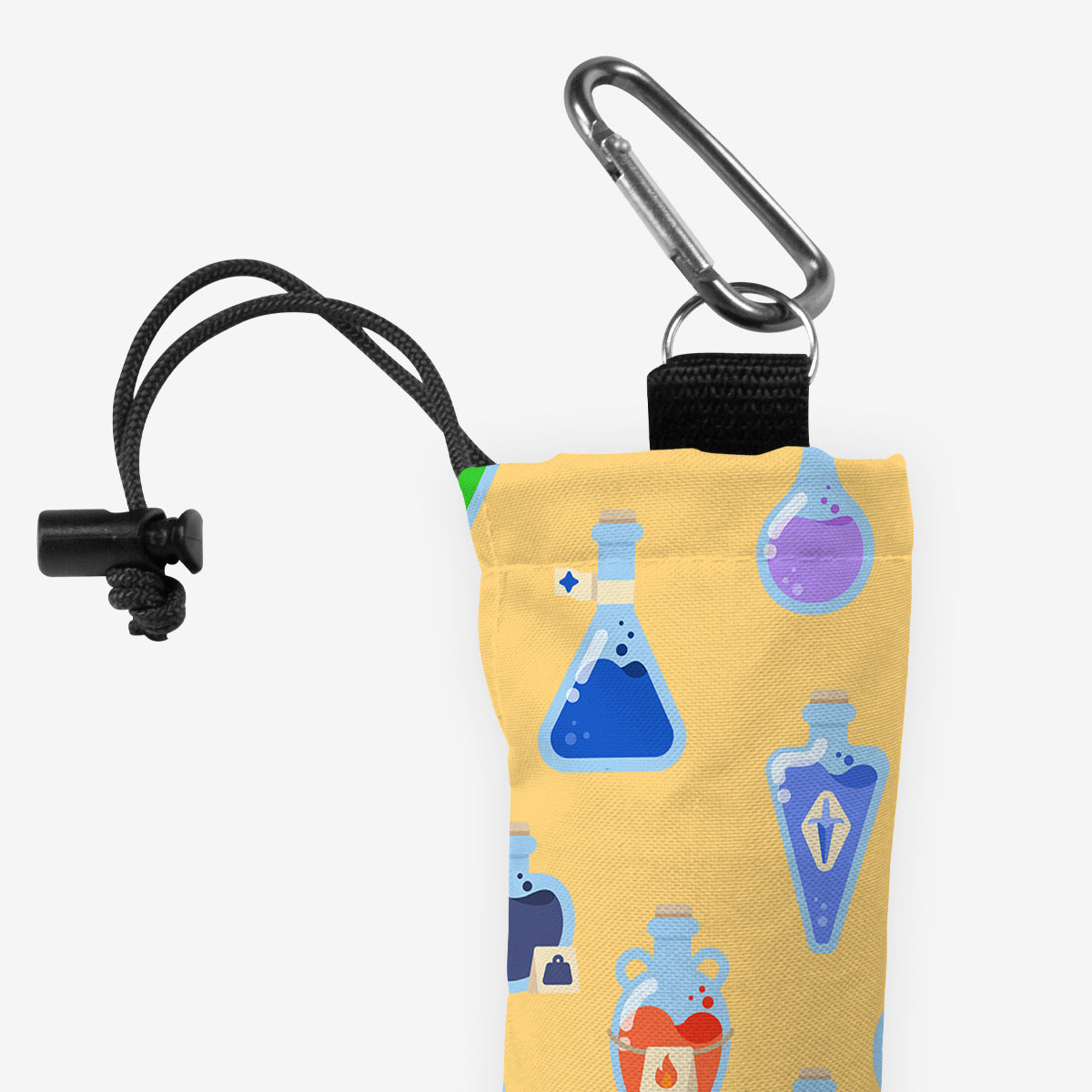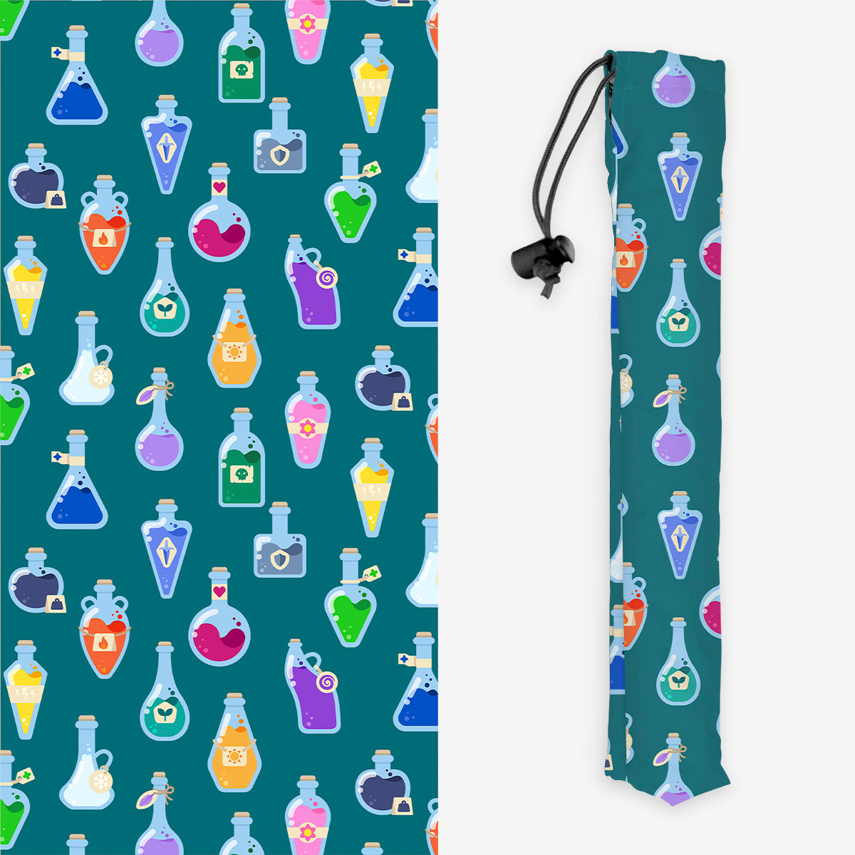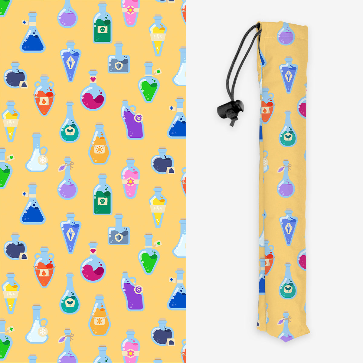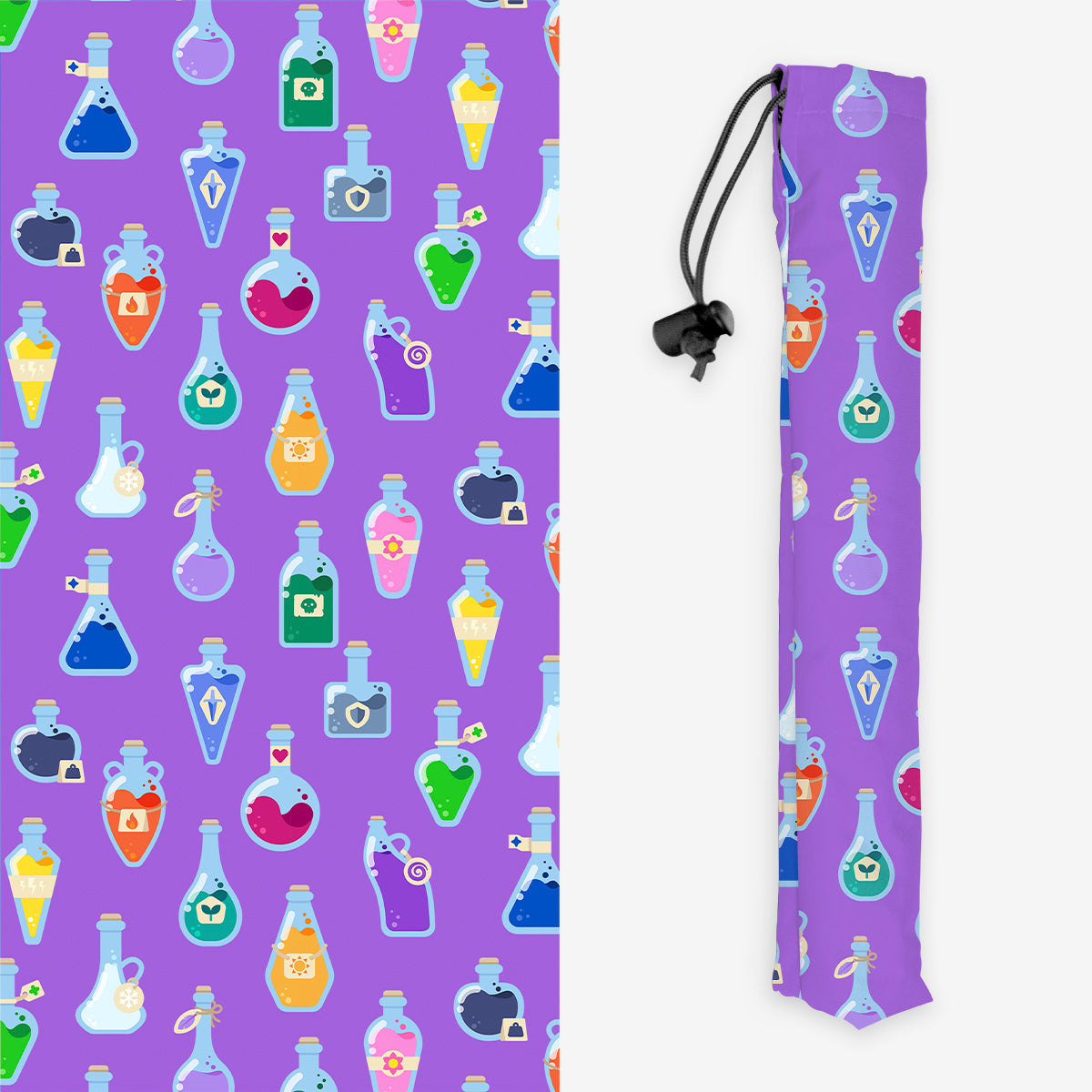 Playmat Bags are specifically designed to hold your mats in style. They are large enough to carry up to two mats. They are coated to be water resistant and include a strap with carabiner for carrying on your backpack. Our bags are hand made in house, and to order. A design that is vertical or patterned would be best for this type of product.